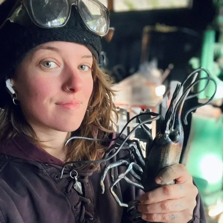 Katie found her love for metalworking after enrolling in the welding program at Vancouver Island University in 2013. She became a certified welder and went on to work locally as well as overseas as an industrial metalworker. Katie expanded her creative horizons, learning the arts of blacksmithing and bronze casting in the Sculptural Metal Program at Kootenay School of the Arts, Nelson, BC. She now has over a decade of experience as a professional metalworker both in industry and the arts.